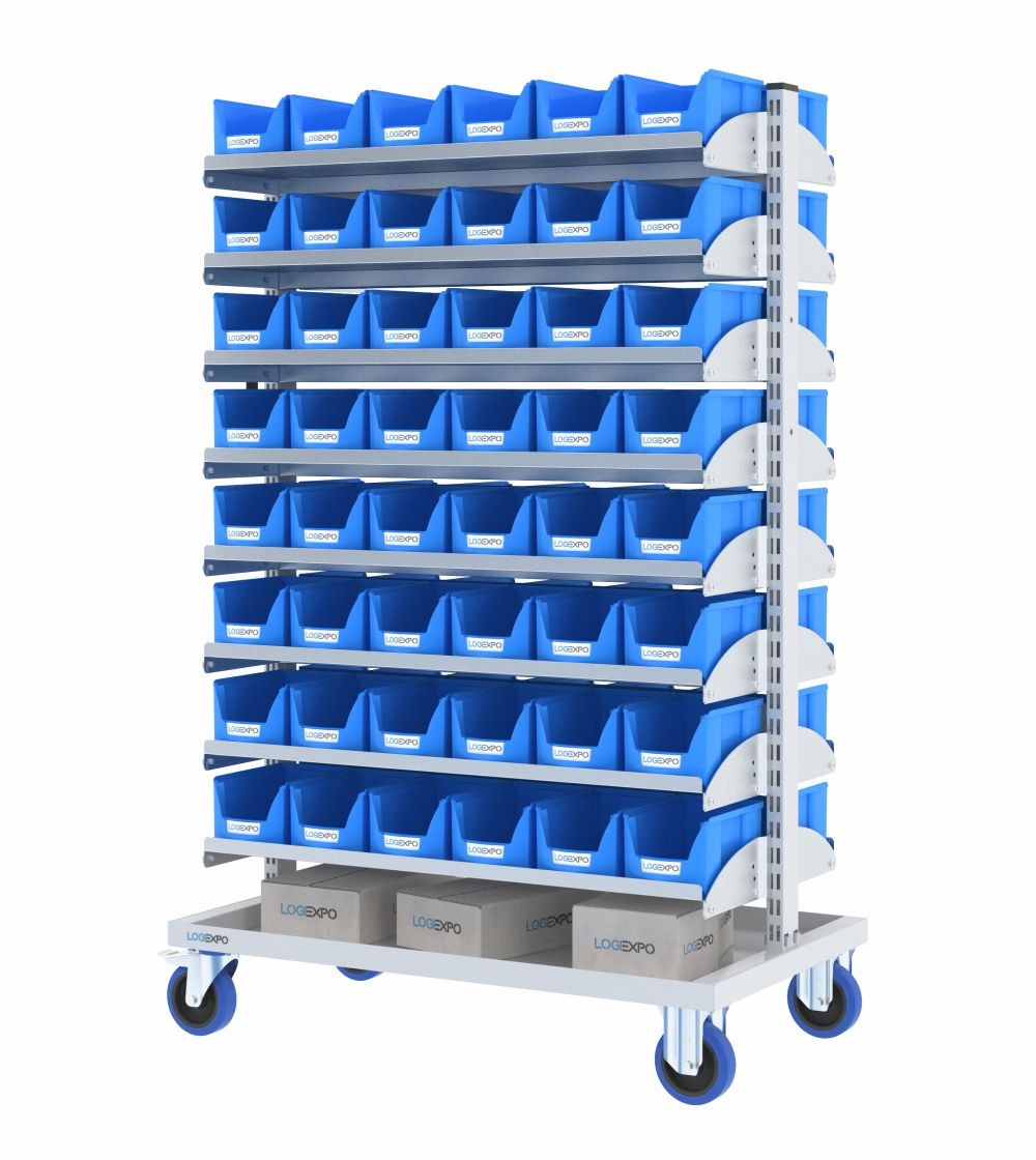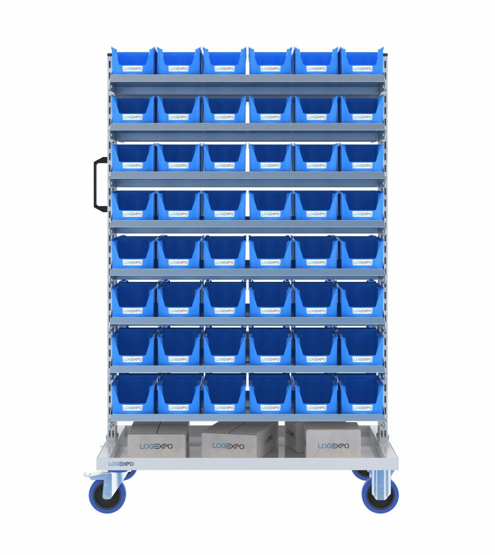 Carrelli porta minuteria con cassetti basculanti, eurobox, contenitori a bocca di lupo, eurocassette e cassette in plastica per picking