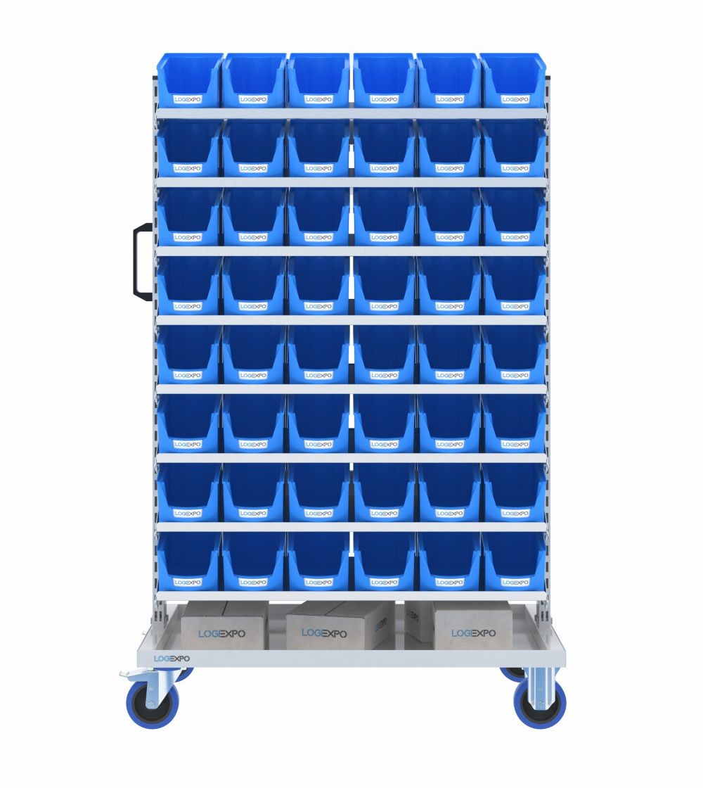 Carrello porta contenitori con 96 cassette bocca di lupo per minuteria