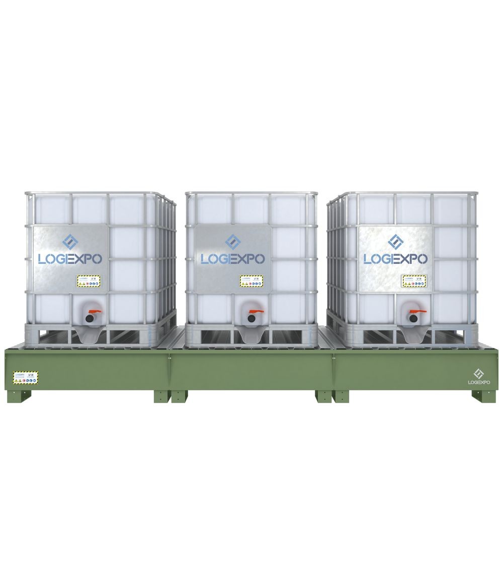Innovativa vasca di contenimento in acciaio realizzata con sistema modulare componibile per lo stoccaggio in sicurezza a norma di legge di cisternette IBC e per impedire lo sversamento di liquidi inquinanti e sostanze pericolose per l'ambiente.