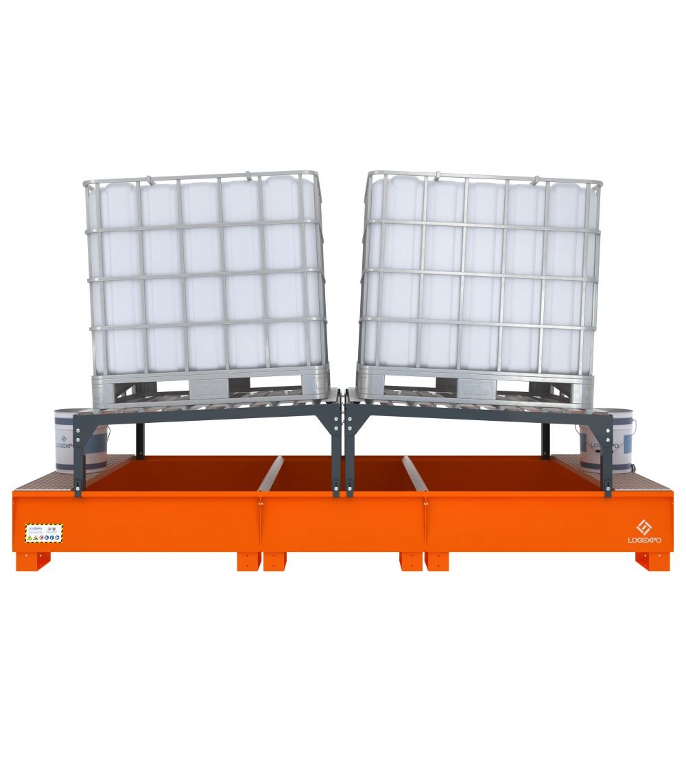 Vasche di raccolta con supporti inclinati realizzate con sistema modulare componibile per cisternette IBC.