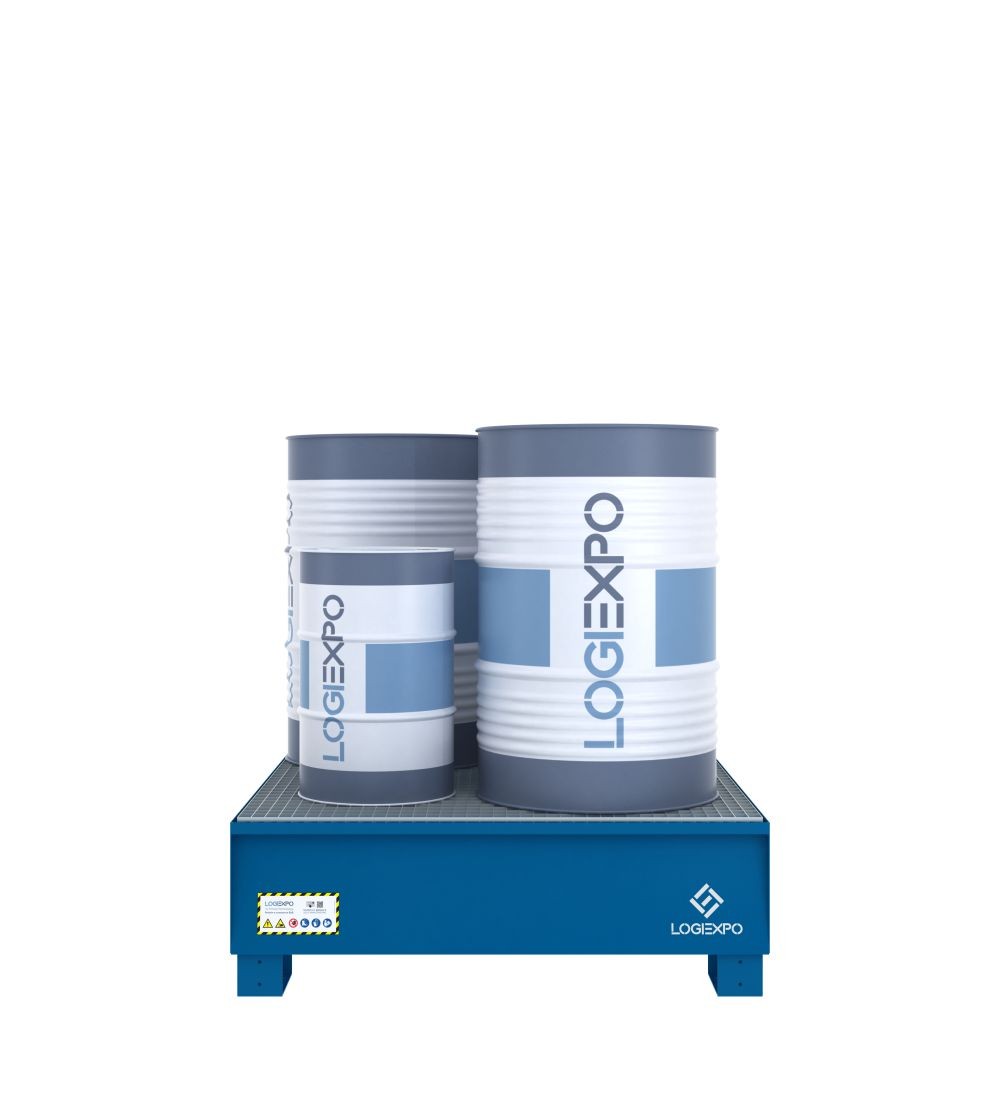 Vasca ecologica anti-sversamento stagna realizzata in acciaio saldato con grigliato zincato per la raccolta e contenimento di liquidi inquinanti, idonea allo stoccaggio verticale dei fusti.