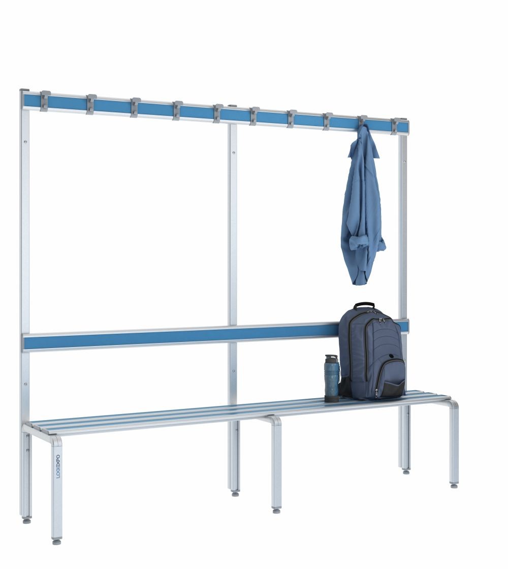Panca spogliatoio singola da 200 cm con appendiabiti e schienale, ideale per ambienti spogliatoio in aziende, palestre, piscine e centri sportivi.