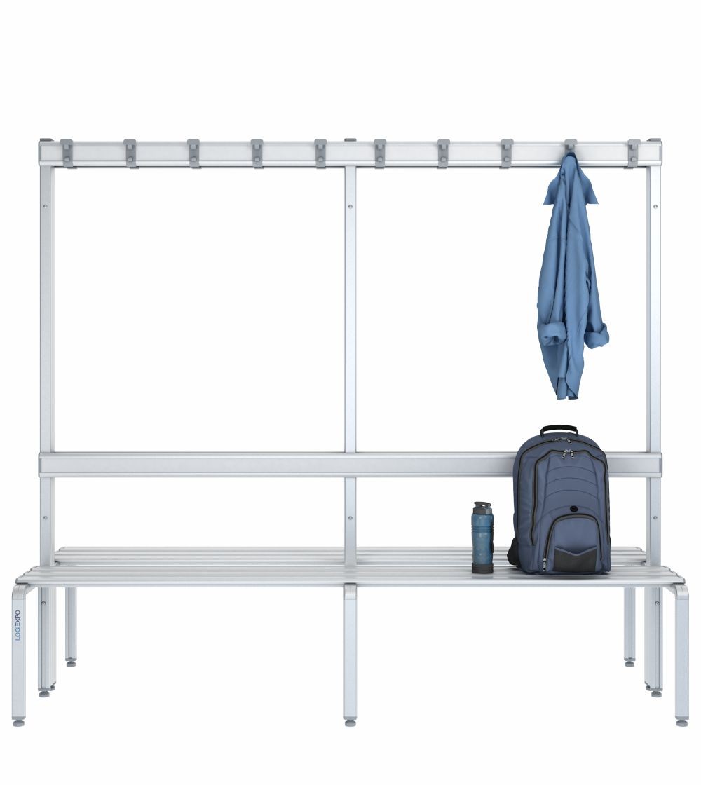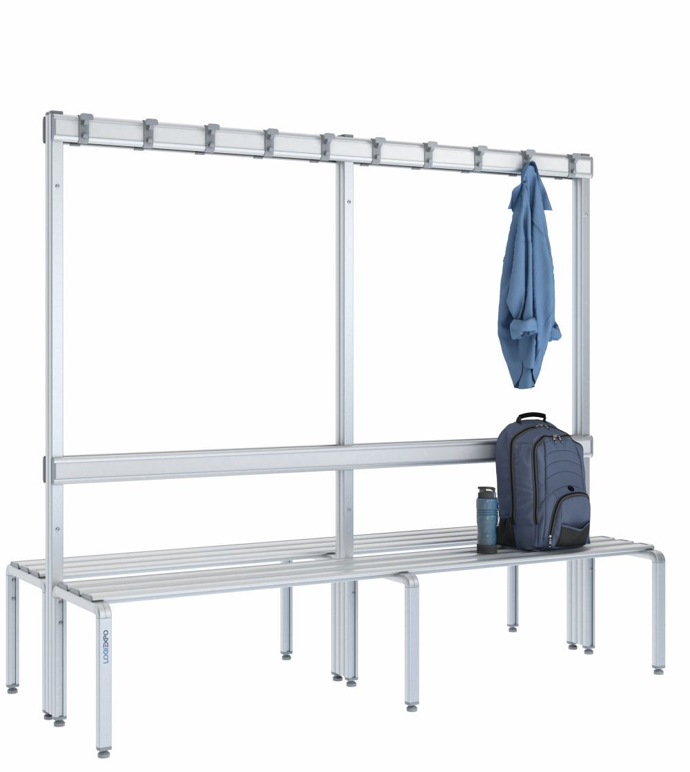 Panca spogliatoio doppia da 200 cm con appendiabiti e schienale, ideale per ambienti sportivi, palestre, piscine e spogliatoi aziendali.