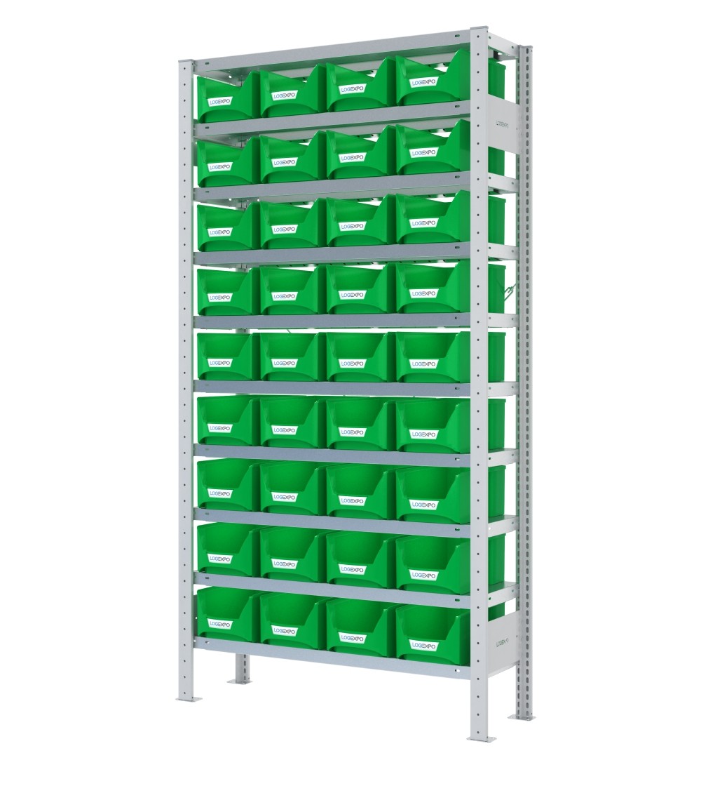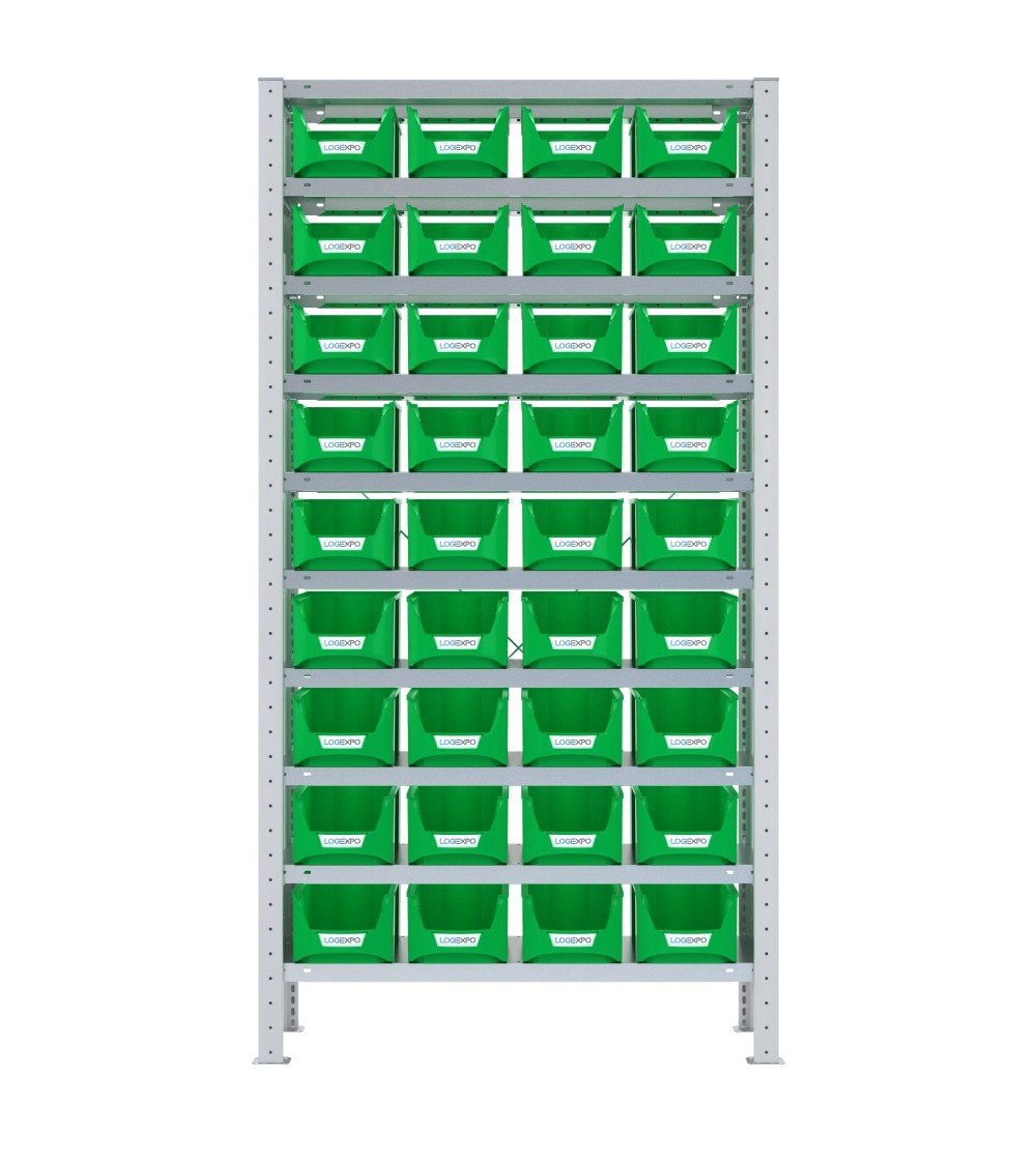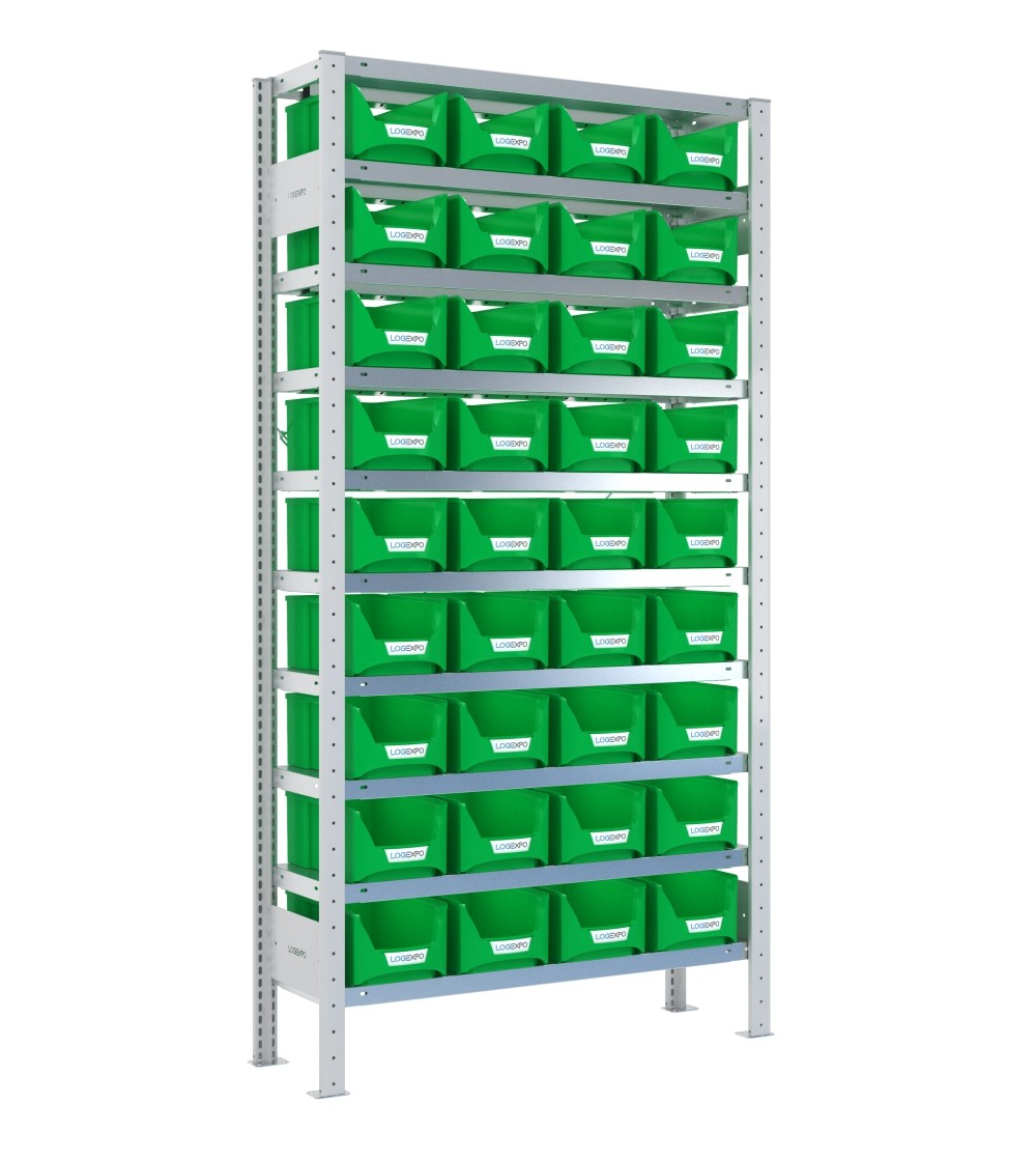 Kit Scaffale componibile ad incastro porta contenitori a bocca di lupo completo di nr. 10 Ripiani mm 1000x300x40h e nr. 36 contenitori a becco inclinato mod. FA-03Z ideali come deposito per le minuterie.